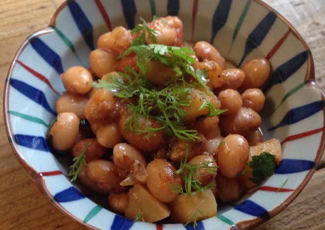 - When it starts to boil, add the potatoes. Cover with lid, turn to a lower heat and cook for about 1 hour or until the beans are the softness you like (I like mine a little firm - about 1 hour cooking).