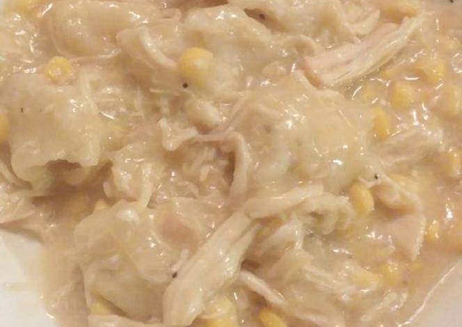 - Place onion on bottom of crock pot. Then chicken, butter, soup, broth and corn