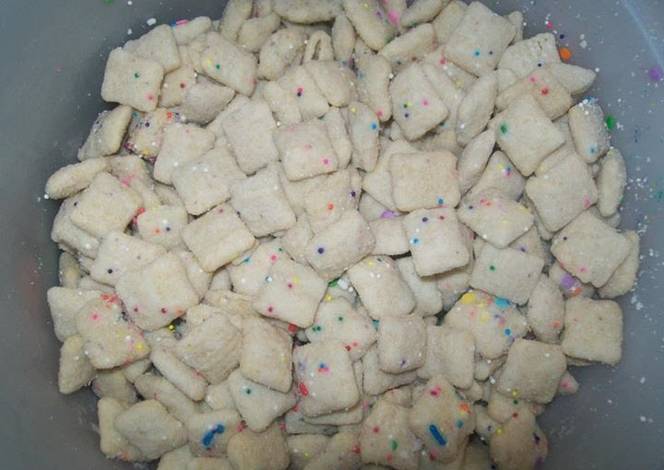 - Pour coated chex in the powdered mixture, Tightly seal container and shake until well coated.