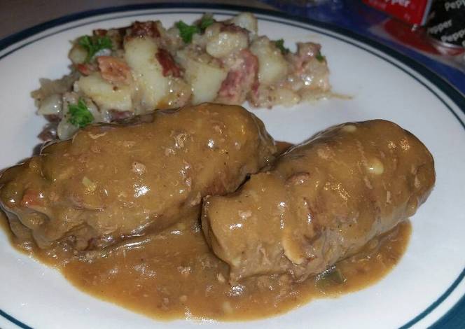 - Add a bit of beef broth & try to scrape the drippings from the meat rolls from the bottom of the pan. Add the rest of the broth& bring to a boil. Let boil for a minute & then reduce heat to a simmer & cover for an hour to an hour in a half.