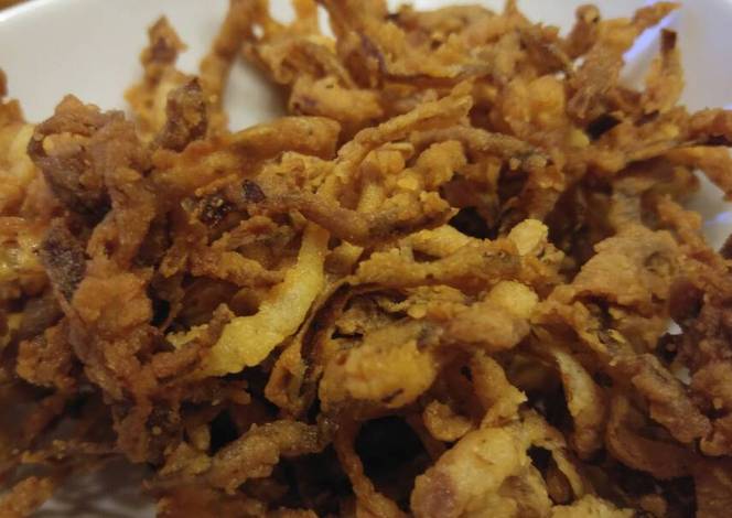 - Remove the strings using a spider pr slotted spoon. Place on a paper towel covered plate. Rinse and repeat until you"ve made all the onion straws