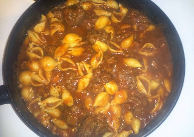 - Cook pasta, and Cook meat with herbs ,garlic, salt, pepper drain then add sauce then let simmer.