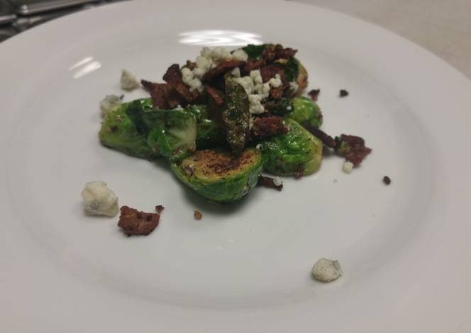 - Bring pan back to medium high heat add olive oil and garlic and saute for 2 minutes or until soft. Add brussel sprouts and saute for an additional 8 minutes. Serve on a plate and sprinkle bacon and bleu cheese and serve.