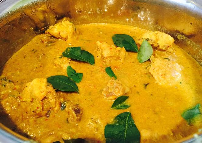 - Add chicken pieces into this. Cover the dish and cook for 5 minutes. Now ,add coconut milk/paste and mix well. Allow this to cook for 2 - 5 minutes or till the chicken is cooked. Add hot water if you need more gravy. Finally add chopped cilantro, curry leaves. Mix everything well and bring it to a boil.