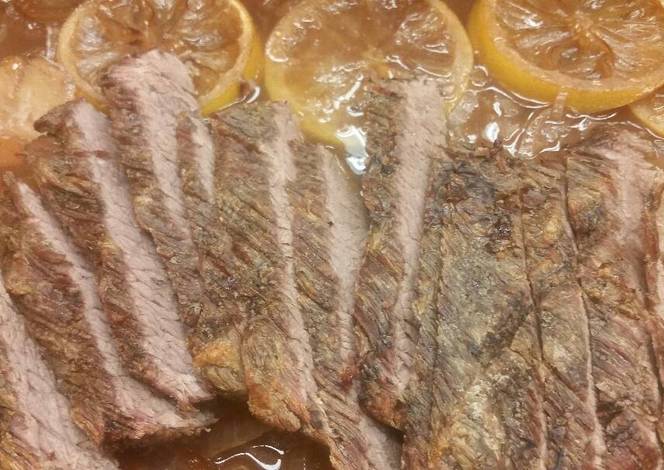 - Place red onions and lemon slices in a casserole dish. Add beef stock. Lay brisket atop. Cover with foil or lid and bake at 350° for approximately 3-4 hours or until brisket is cooked to desired doneness.
