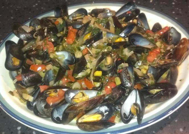 - Add the tomatoes, parsley, scallions, and a bit of white wine to the pan and cover. Shake the pan and turn off heat. Let steam for another 1-2 minutes.