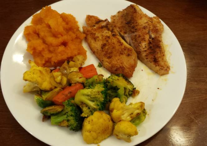 - Place aluminum foil over cookie sheet (for easy cleaning) and spray with Pam. Place tilapia fillets on the foil.