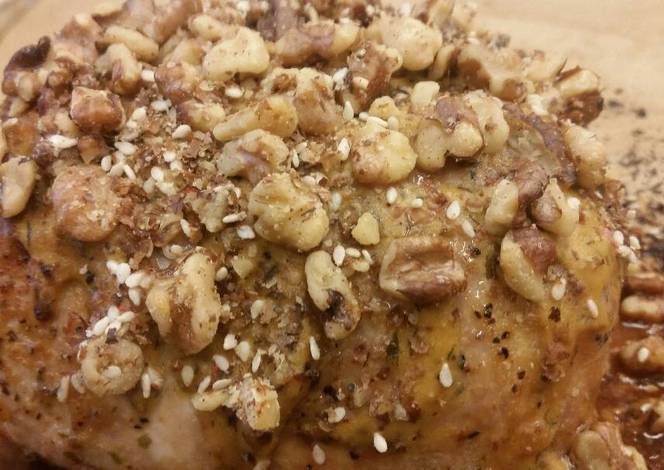 - Bake at 350° for approximately 1 hour or until pork reaches desired doneness. Pour mustard and walnuts atop pork loin during last 5 minutes of cooking.