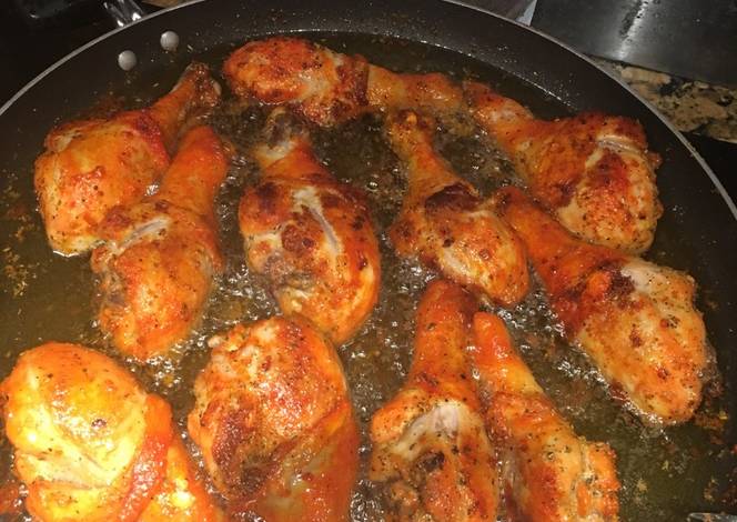 - Lower heat to a medium heat flip chicken and sprinkle Sazon on entire chicken. Let chicken fry about 7 minutes before you flip chicken keep doing and rotate for about 45 minutes for even cooking. Chicken will be browned to eye and no pink inside!