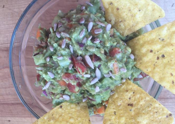 - Equal quantity to the avocado of very finely diced chopped vegetables - whatever needs eating, be it carrots, celery, radishes, courgettes, sugar snap peas, broccoli stem…be creative!