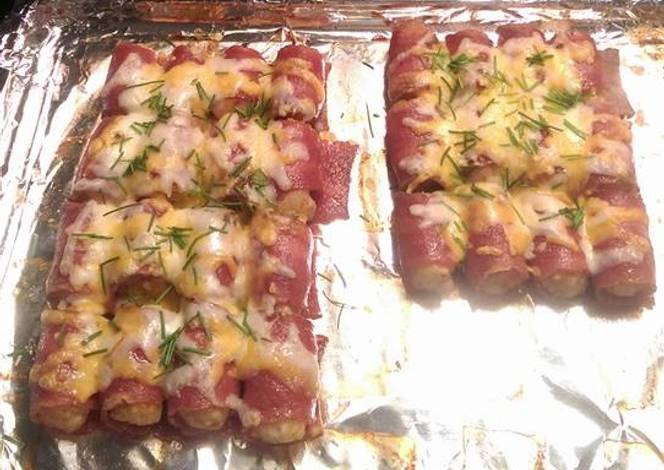 Stack wrapped tater tots. Sprinkle cheese all over.