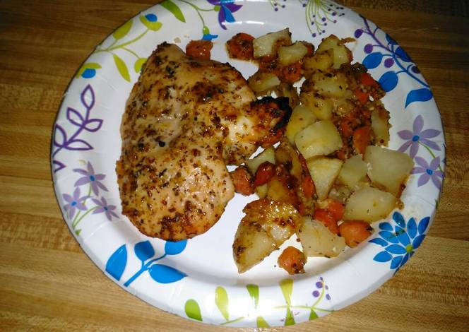 - Marinate the chicken breasts with the sauce. Don"t use all the sauce because you will use it to spread over the carrots and the potatoes.