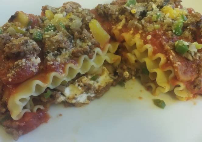 - In center of each noodle, place 1 tbsp of cream cheese. Cover with 1.5 tbsp of meat mix, and 1 tbsp of veggie mix. Fold one edge in, and then the other over the top.