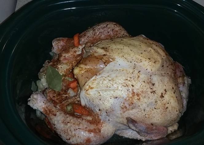 - Mix all spices including more salt and pepper. Just add a little of everything. Sprinkle all over, rub in. Place chicken in crock pot with 1 Bay leaf. Do not add any liquid chicken will make its own