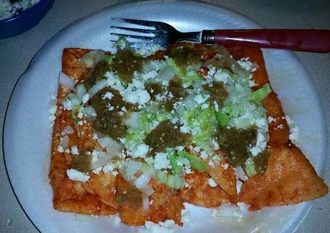 - In a seperate skillet, grease bottom with vegetable oil & turn on medium heat. Take a corn tortilla & dip into the chile sauce, then place in greased skillet to fry. While frying, place a little bit of shredded chicken on one half of the tortilla & gently fold the other side over with a tongs, so as to make your first enchilada. Keep repeating these steps until the chicken is gone.
