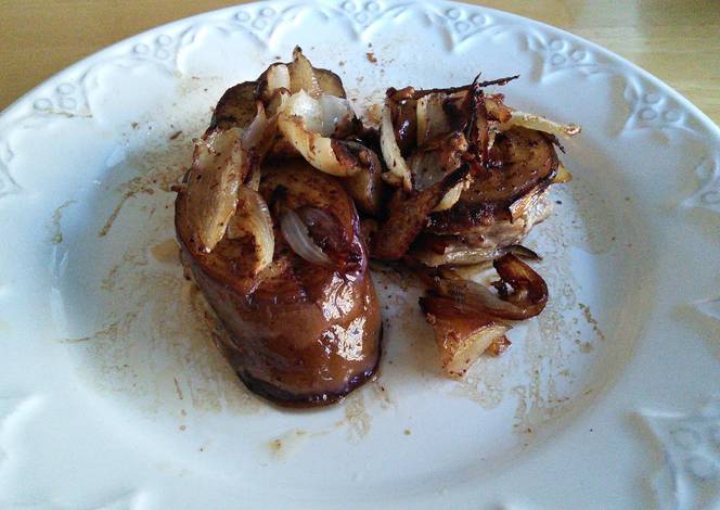- Add the onion wedges when you get all the eggplant pieces into the pan.