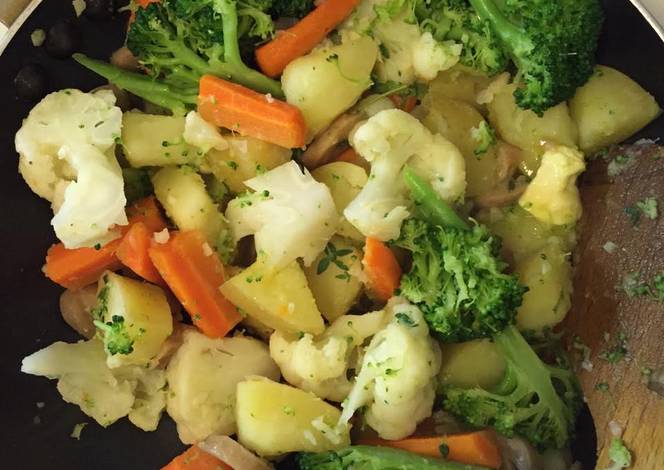 - Add the potatoes, carrots, cauliflower and mushroom to the garlic butter sauce and give everything a stir to coat with the butter and garlic sauce