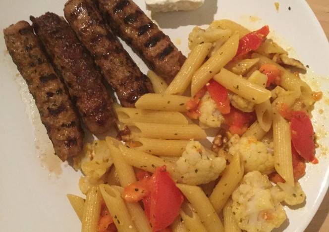 - Put the kebabs and the pasta with the vegetables on a dish and add a piece of greek feta, I totally recommend to add feta cause it gives another taste to the food, loving it!!!