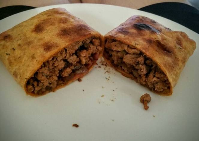 - Lay out a tortilla then add a thick layer of the ground turkey mix and pile onions and bacon on top. Fold and close the burrito and repeat until you are out of ingredients.
