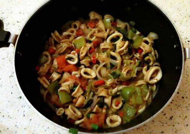 - Add the marinated calamari (do not add the excess marinating liquid) and stir fry for 5minutes. Season with shallots and more salt (if needed). Make sure not to overcook the calamari as it will become rubbery/hard to chew and might have to cook for 30 or 60 mins to return back to its tender stage.