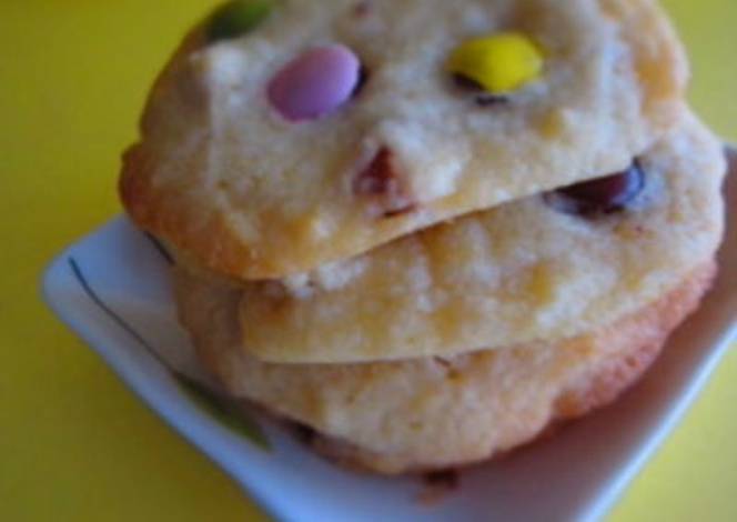 - Drop rounded tablespoonfuls of cookie dough onto the parchment paper. Put 5 M&M chocolates for each cookie.