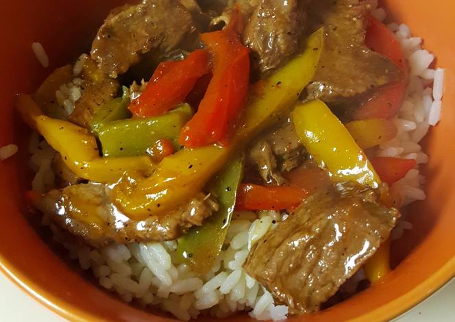 - Put a scoop of the rice into a bowl, or on a plate. Top it with the gravy/steak/pepper mix and serve. Be careful, the gravy will be really really hot.