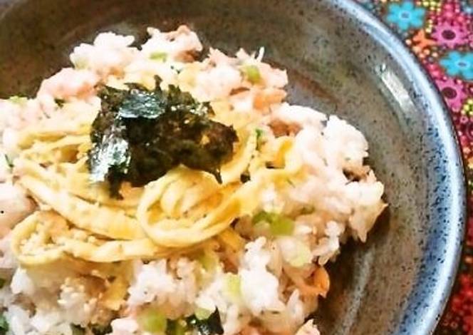 - Serve rice on a plate, put "kinshi-tamago" on top of the rice and add the torn seaweed to garnish.