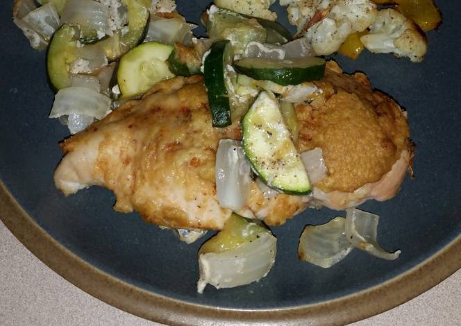 - Place chicken on top of onion and zucchini. Season with salt, pepper, paprika, and lemon juice.