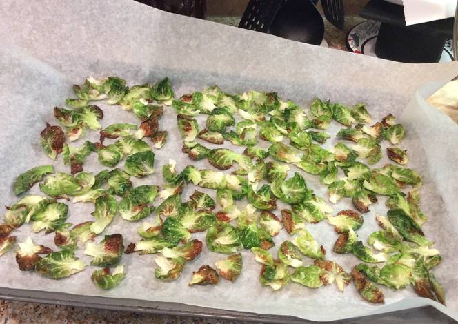 - Line the Brussel sprout leaves a large cookie sheet with parchment paper. Divide leaves evenly in a single layer.