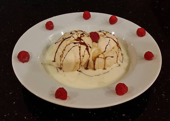 - To assemble, pour some creme anglaise on a platter or in individual dishes. Float meringues on top