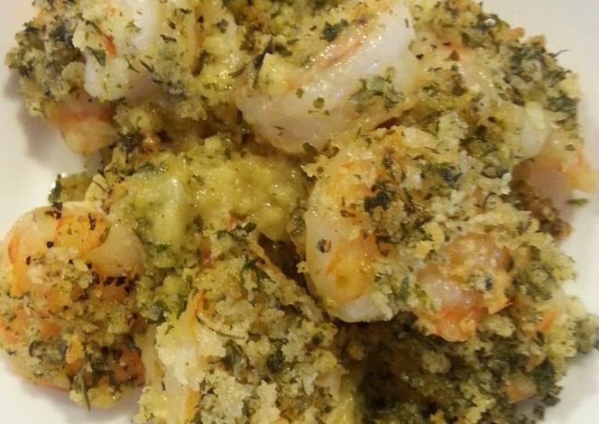 - In another dish use a fork to mix melted butter , panko, parsley until well combined. With fingers sprinkle the mixture evenly over shrimp in baking dish.