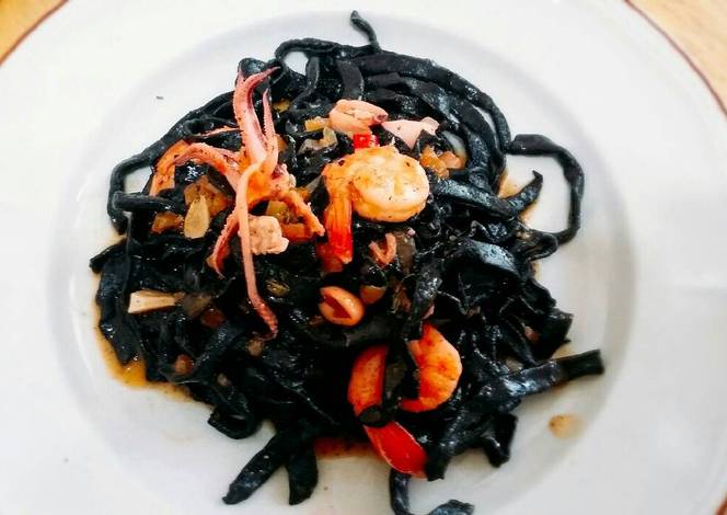 - In a bowl, whisk eggs, salt and squid ink. Then set aside.