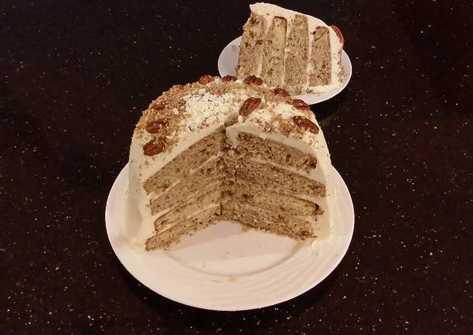 - Decorate with whole pecan halves and white chocolate shavings. Refigerate cake at least 2 hours before slicing