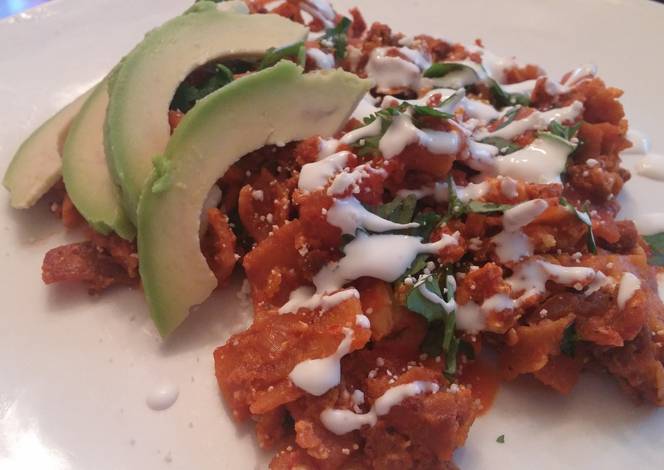 - Add poblano pepper, sauce and tortilla in pan and cook at low temp. Cook until well incorporated.