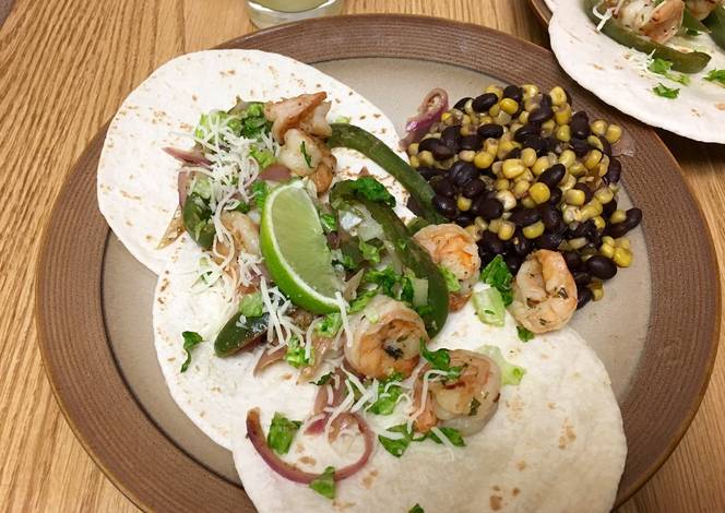 - Remove from heat. Place a portioned mix of shrimp on small flour tortillas and garnish with chopped Lettuce, sprinkled Monterrey cheese and a Lime wedge.