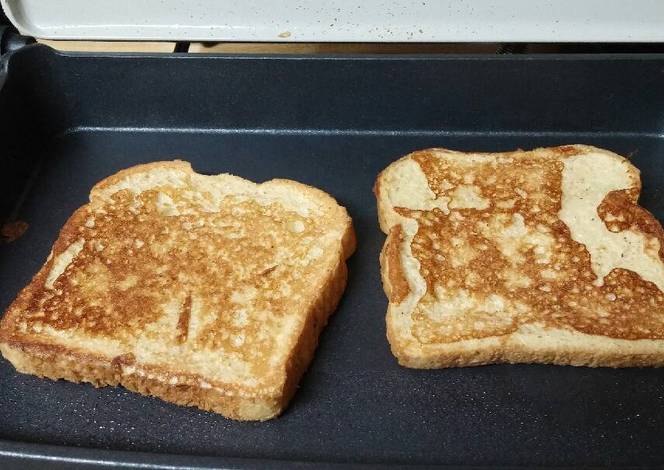 - Lightly grease a griddle or fry pan with either spray or butter. About medium high is good. Brown the bread for about 2 mins then turn and brown the other side. Don"t cook too fast, as the outside will brown and you will have uncooked "custard" on the inside. Your toast will also fall apart.