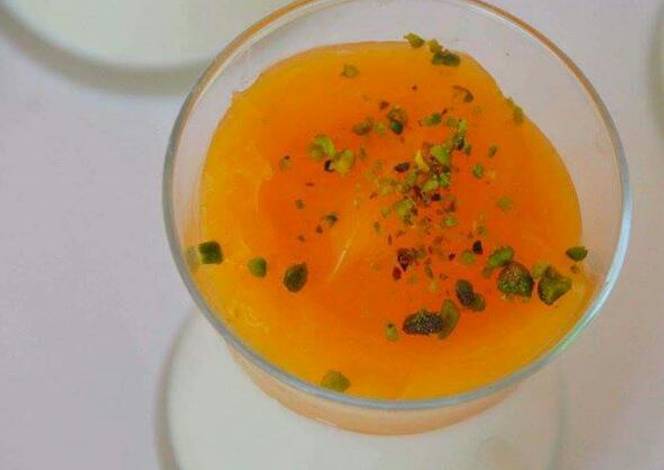 - Pour it carefully over milk pudding cups. Refrigerate and garnish with pistachios & qamardeen swirls.