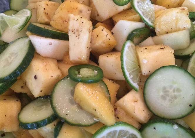 - Cut all fruits/cucumber and place in large mixing bowl. Add Balsamic Vinegar, sugar, salt, pepper, lime juice and jalapeño peppers to fruit. Stir to incorporate all ingredients.