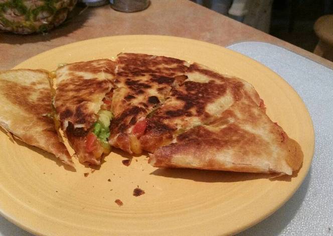 - Sprinkle some more cheese over the tomato and avocado, then fold the empty/plain half of the tortilla over the other side of it. Flatten the quesadilla with a spatula.