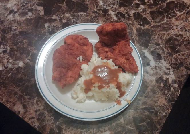 - Combine ingredients for breading. Dip chicken in flour mix one at a time, shaking off access flour. Dip in milk, then back in flour. Set aside.