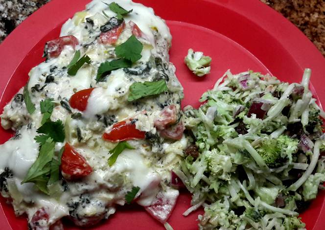 - Soften cream cheese in microwave on low setting. Once it"s nice and soft whisk in chicken stock and mix together. Add spinach, artichokes, tomatoes, italian dressing mix and black pepper. Then stir in the onions and garlic.