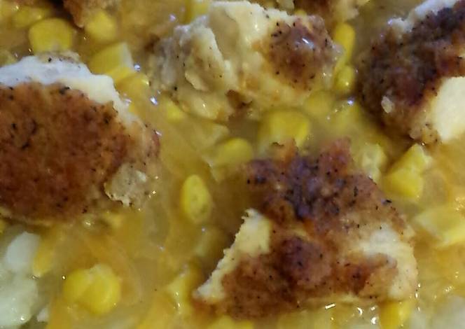 - Plate mashed potatoes, drizzle gravy, and top with corn, cheddar cheese, and chicken. May sprinkle with pepper if taste desires.