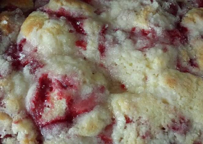 - Pour batter into prepared baking pan. Add diced strawberries over top then sprinkle topping over the strawberries.