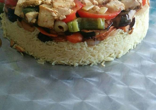 - Okay now you want to get one large pot to fit in your fried vegetables and rice. Whichever vegetable you layer first is the one that will appear on top as we will flip the pot upsidedown.