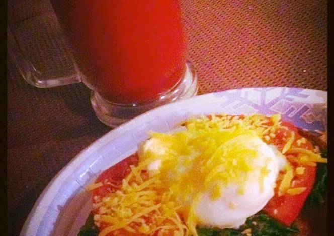 - Lay the spinach down on your pita toast, then your tomato, and follow with your egg. Top off with sprinkling about 3tbsp of your Fatfree cheddar