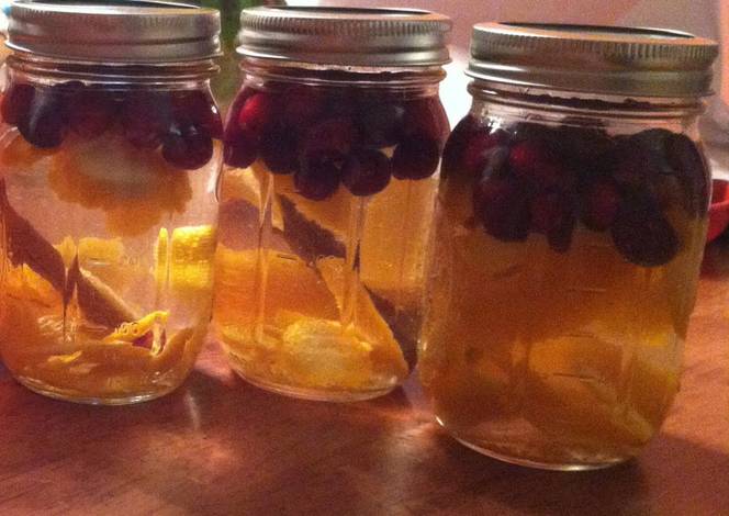 - Peel large chunks of orange rind (just the orange part) and place three or four pieces in each jar