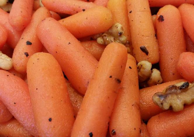 - Boil baby carrots just past al dente. Drain. Return to pot. Add maple, toasted walnuts, brown sugar, and honey. Stir.