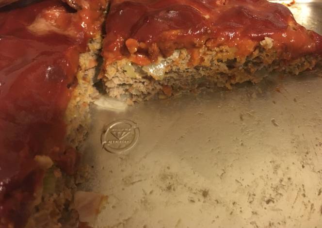 - Place meat mixture into greased loaf pan. Top with bacon, pour on sauce