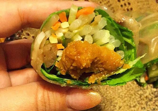 - In a shallow but wide brimmed bowl pour warm water. Submit one rice roll wrap into the water until it is a bit gooey. Make sure it isn"t too soft because it"s hard to work with. It softens as you put the veggies on.