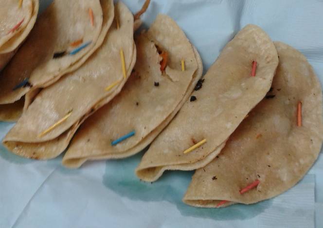 - Then you cook it all together in a frying pan then u heat up corn torttias pack them a little , then poke in tooth picks to hold them together.so you end up with a taco then depfry sooo goood